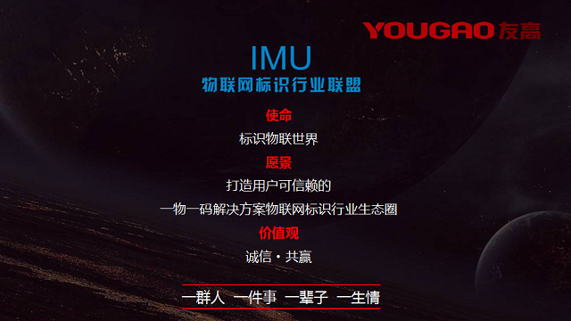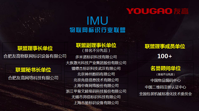 在總經(jīng)理陳文正先生的帶領(lǐng)下,友高公司不僅注重自身品牌的升級發(fā)展,更注重行業(yè)的可持續(xù)進(jìn)步,IMU物聯(lián)網(wǎng)標(biāo)識行業(yè)聯(lián)盟正是基于此而成立,友高作為IMU聯(lián)盟的理事長單位和秘書長單位,始終堅(jiān)持以“誠信·共贏”為核心價值觀,最大限度發(fā)揮IMU聯(lián)盟的資源與價值,為成員單位及行業(yè)發(fā)展做貢獻(xiàn),以完善的一物一碼產(chǎn)業(yè)鏈體系為各行各業(yè)提供最合適的一物一碼解決方案,為制造企業(yè)產(chǎn)業(yè)升級,為智能化未來提供助力。