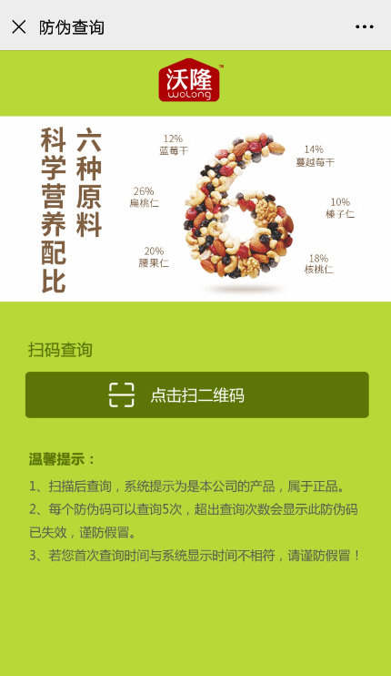 堅果炒貨行業(yè),通過一物一碼技術(shù),全面升級數(shù)字化運營體系,溯源、防偽防竄、營銷結(jié)合應(yīng)用,綜合效能,有利于企業(yè)掌控整個渠道,鞏固產(chǎn)品在市場在競爭中的優(yōu)勢。沃隆堅果通過對生產(chǎn)過程中產(chǎn)品賦碼及流通銷售信息的監(jiān)管,工作人員可對每一件產(chǎn)品的身份賦碼、物流、信息流進行跟蹤追溯,從而實現(xiàn)對產(chǎn)品從生產(chǎn)、入庫、銷售、流通、分銷、防偽防竄的管理和控制。對于普通消費者而言,通過微信掃一掃功能,掃描包裝上的二維碼,即可進行真?zhèn)尾樵儭?/span>
